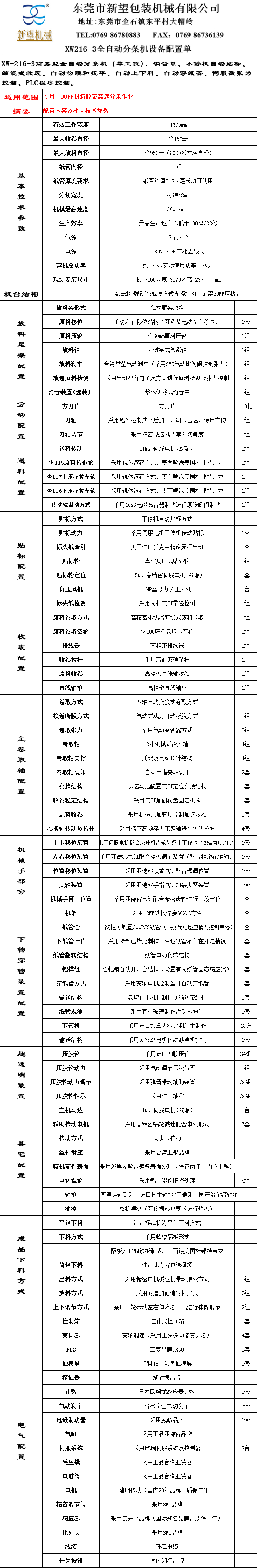 XW-216-3簡(jiǎn)易型全自動(dòng)分條(單工位)關(guān)鍵技術(shù)詞:消音罩、不停機(jī)自動(dòng)貼標(biāo)、纏繞式收廢、自動(dòng)切膜和撫平、自動(dòng)上下料、自動(dòng)穿紙管、伺服微張力控制、PLC程序控制。